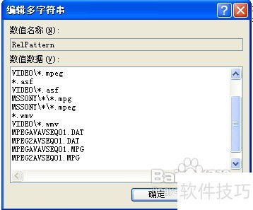 4、 在右侧窗口中找到名为 RelPattern 的字符串值,双击打开后,保留原有内容不要删除,仅在末尾添加 MPEGAVAVSEQ01.DAT 即可完成修改。