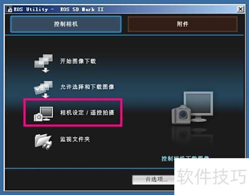 1、 使用USB线将相机与电脑连接,启动EOS Utility软件,选择相机设置/遥控拍摄选项,此时会弹出一个新窗口。窗口顶部显示相机当前的参数和电池电量等状态信息。通过鼠标和键盘即可调整相机的各项设置。点击红色边框内的按钮,进入遥控拍摄界面,随后可对快门速度、光圈、ISO等所有参数进行远程操控与设置,方便实时拍摄与监控。