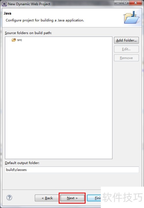 7、 该窗口展示WEB项目中需编译的JAVA文件所在目录,默认为SRC目录,无需修改,直接点击即可继续。