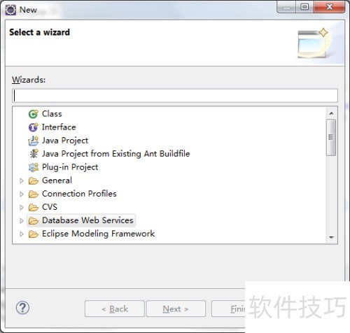 4、 该界面弹出的查询窗口用于查看所有可创建的项目类型,例如Java项目、Web项目等,相关信息均可在此窗口中查找获取。