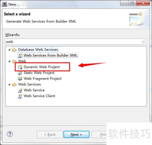 5、 我们要创建一个WEB项目,首先在查询输入框中键入WEB,系统将自动显示所有与WEB相关的项目类型。找到Dynamic Web Project后,用鼠标点击选中该项,随后点击Next按钮,进入下一步配置界面,继续完成项目的创建流程。