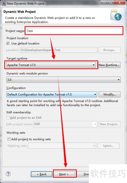 6、 此处用于填写项目的基本信息,如项目名称及运行所需的服务器版本,可按需选择Tomcat或其他服务器。本文以为例进行测试创建,输入完成后,点击按钮继续下一步操作。