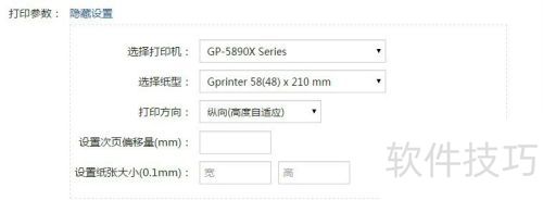 5、 选择GP-5890X系列打印机,设置纸张类型为Gprinter 58(48)×210mm,打印方向选为纵向(高度自适应),最后点击确定完成设置。