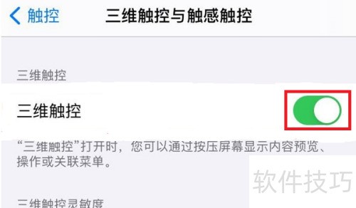5、 进入三维触控设置,开启触感触控功能的开关即可完成操作。