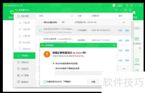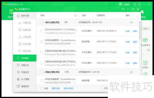 1、 首先,若杀毒软件误删了sw的某个程序,需进入其恢复区,将文件恢复并添加信任,避免再次误杀。部分用户可能不会遇到此问题。