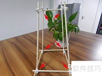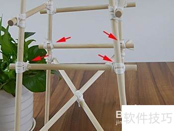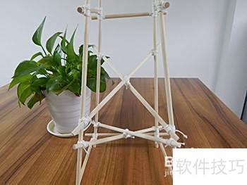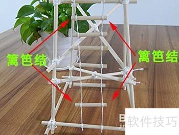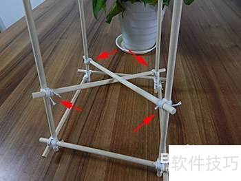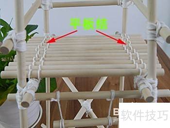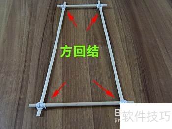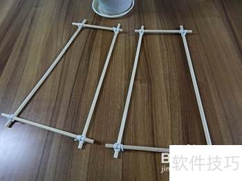 10、 在台面上方的横杆两端,用方回结分别连接左右支架各一根17厘米圆木棍。