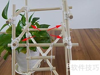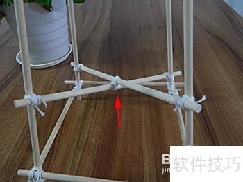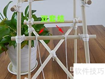 4、 用两根30.5厘米圆木棍,以十字结方式如动图所示固定在对角支架上。