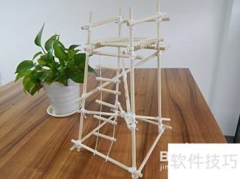 11、 使用平板结将12根17厘米长的圆木棍(可根据实际情况增减)与左右支架的横杆绑扎连接,完成台面结构的搭建。