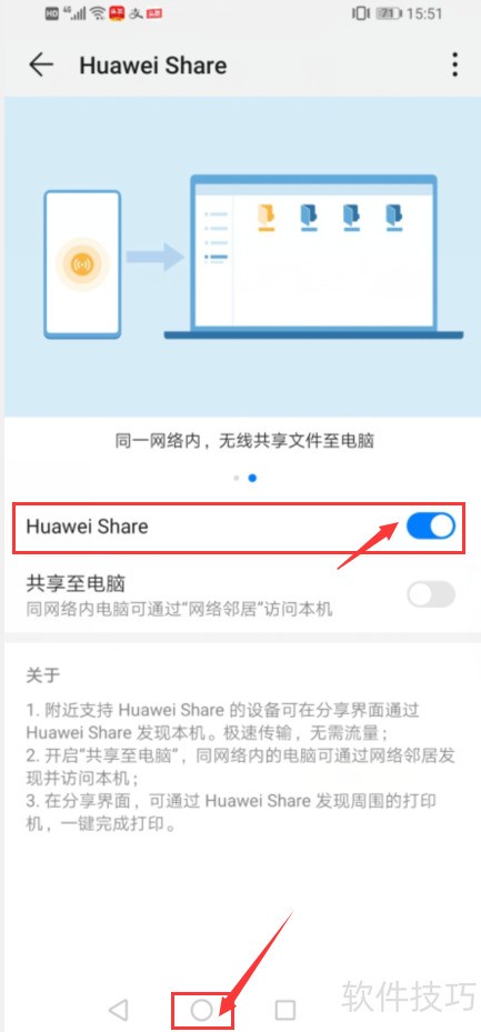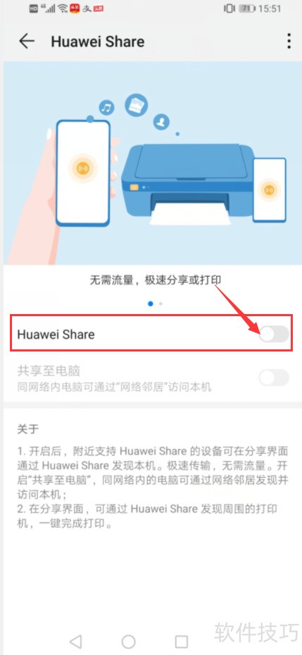 8、 在华为分享设置中,开启华为分享功能。