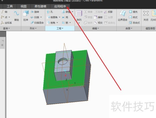 1、 首先启动Creo软件,打开之前创建的实体文件,选择应用程序命令。