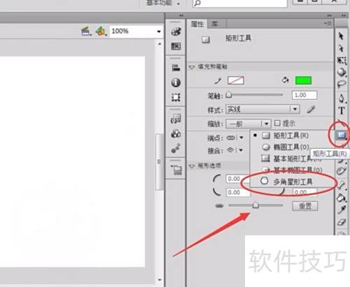 2、 单击矩形旁边的下拉按钮,选择多角星形工具,所示。