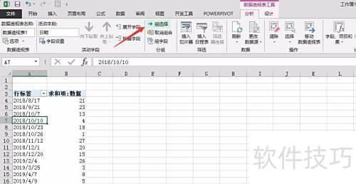 5、 在数据透视表中选中日期单元格,点击分析选项卡中的组功能,所示。