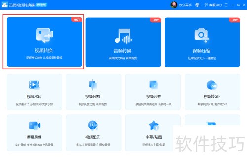 1、 打开迅捷视频转换器,主界面提供了视频转换、分割、合并及转GIF等多种功能选项。根据需要将FLV转为MP4,可直接选择视频转换功能,若还有其他视频处理需求,也可灵活选用相应功能进行操作。