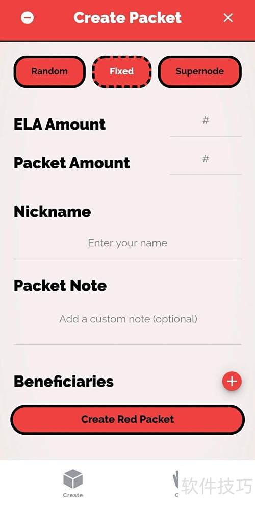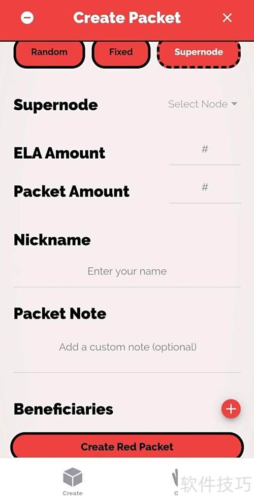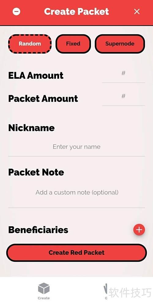 3、 Red Packet 包含两个页面:创建和领取。在创建页面中,提供随机红包、定额红包以及超级节点红包三种类型。