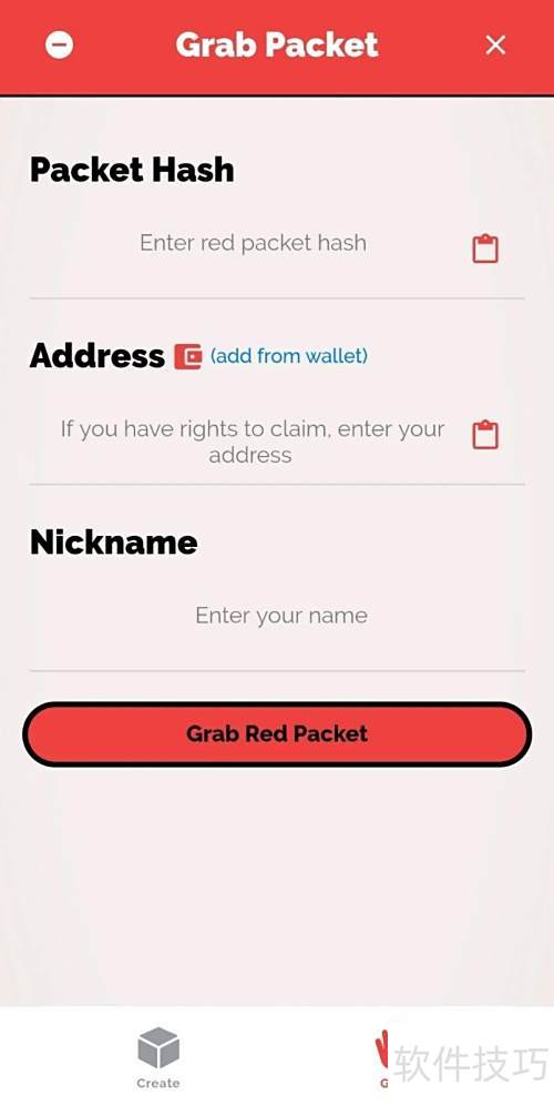 4、 Grab页面即为领取红包的功能。用户点击红包链接后将进入该页面,选择自己的钱包地址并输入姓名,即可完成红包领取。