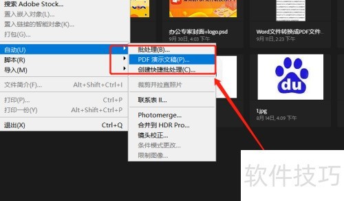3、 我们也可以利用图像处理软件PS将JPG图片转为PDF文件。打开PS后,点击右上角文件菜单,选择下方的自动功能。接着在自动选项中点击PDF演示文稿进行操作。