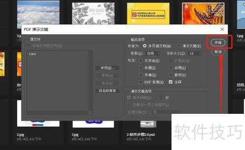 4、 选择后界面会弹出PDF演示文稿对话框,将准备好的图片上传至其中,设置好输出选项后点击保存即可完成操作。需要注意的是,此方法不支持将多张图片合并为一个PDF文件。