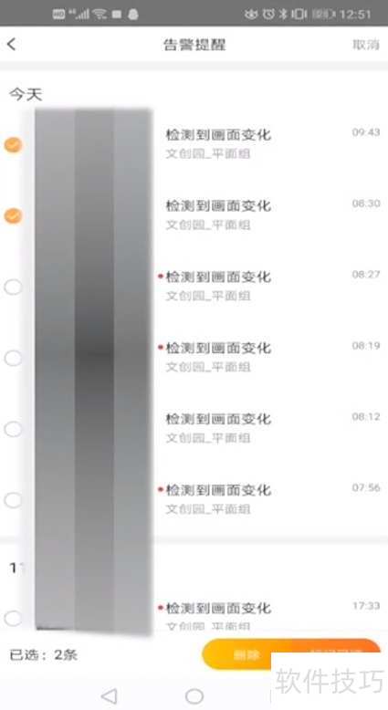 5、 点击手机右上角告警提示,选择要删除的监控视频。