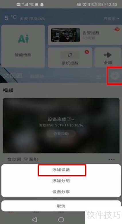 4、 打开萤石界面,点击加号,选择添加设备选项。