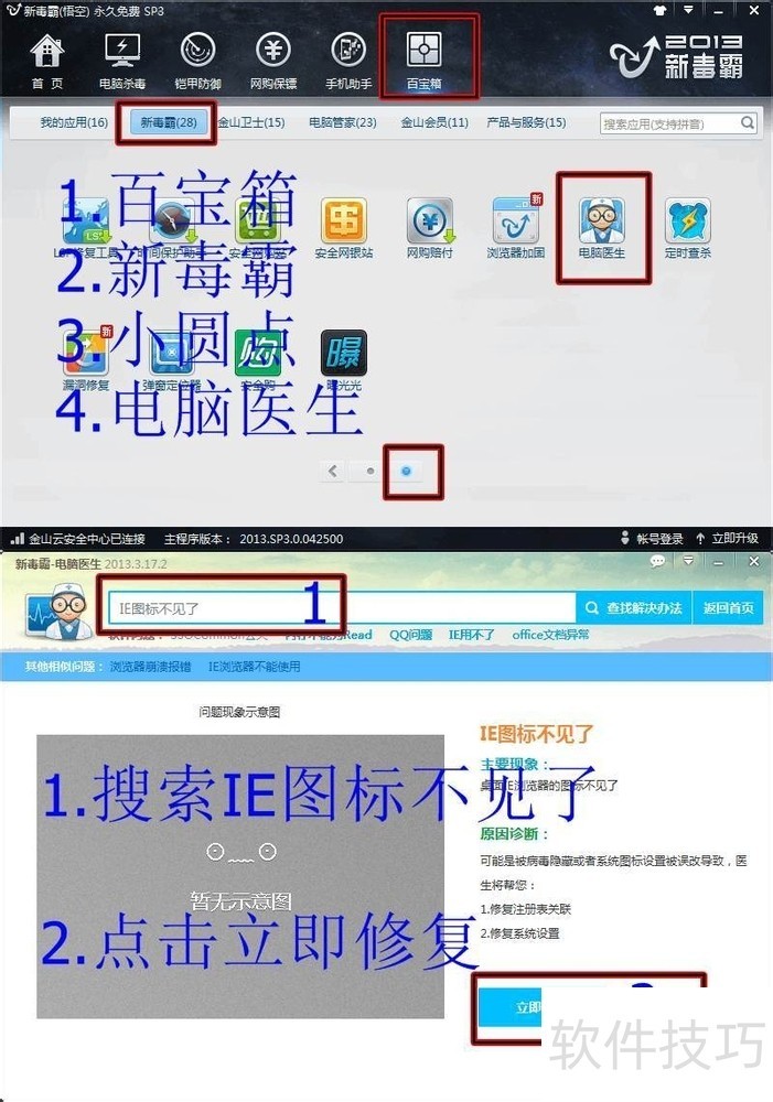 6、 杀毒软件中的电脑医生功能可一键修复IE图标消失问题,自动完成系统修复操作。