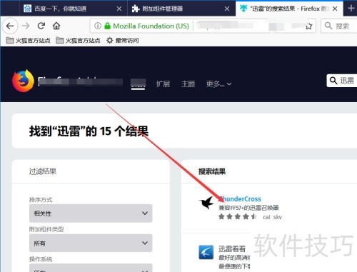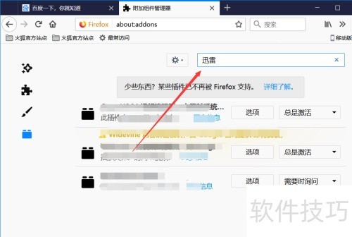 4、 在火狐浏览器插件页面的搜索栏中输入迅雷,按下回车键进行搜索,所示。
