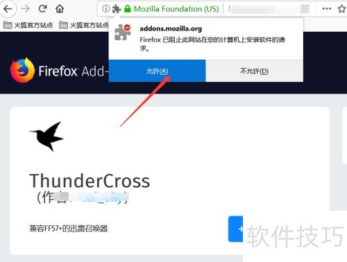 6、 点击后火狐浏览器会弹出安装组件提示,直接点击允许即可,所示。