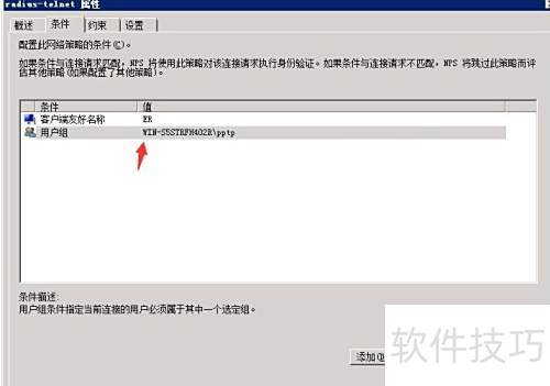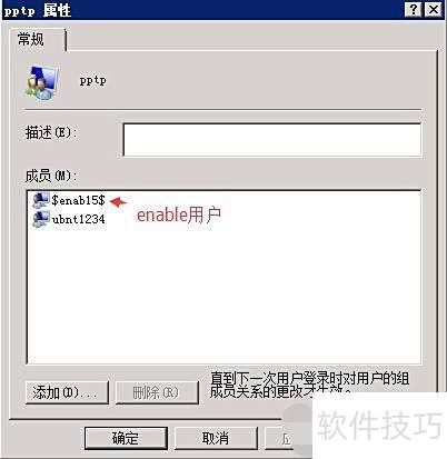2、 首先,完成Radius服务器的配置,添加相应的网络策略和访问服务角色。接着创建一个用户,例如用户名为ubnt1234,密码设置为ubnt-1-2-3-4,并将该用户加入到pptp组中。此外,再新建一个具有enable权限的用户,设置密码后同样加入pptp组,以便用于enable密码的使用。