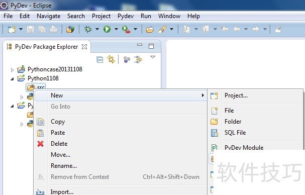 31、 在Eclipse的菜单栏中,依次选择File > New > Project > Pydev > Pydev Project,创建一个名为PythonCase的新项目,然后点击Next。