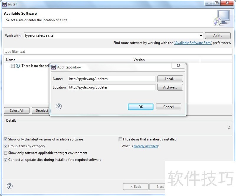 25、 在Eclipse中,依次选择Help菜单下的Install New Software...,点击Add按钮,输入网址http://pydev.org/updates,完成下载与安装操作。
