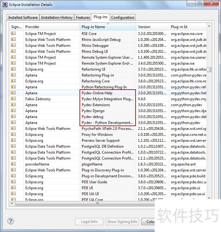 23、 重启Eclipse后,点击菜单栏的Help → About Eclipse → Installation Details → Plug-ins,若列表中显示PyDev相关组件,则说明安装已成功。
