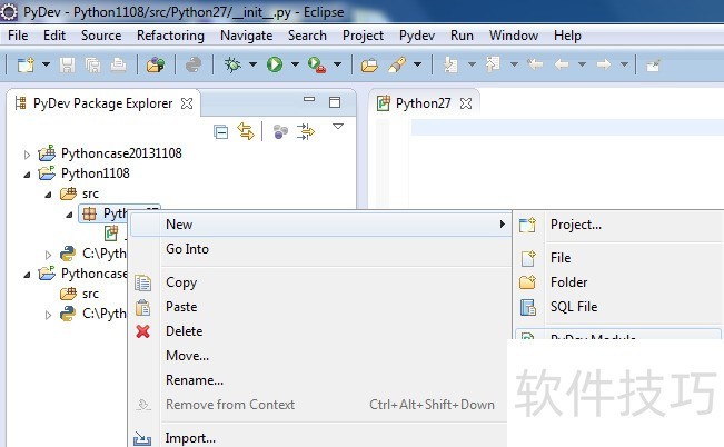 37、 创建Pydev Package后,右键点击该包,依次选择New和Pydev Module。