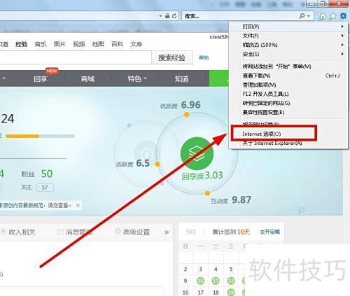 2、 这是设置按钮,点击后弹出列表,选择Internet选项。