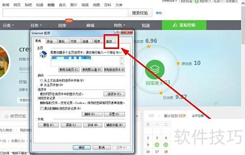 3、 系统将弹出 Internet 选项窗口,界面包含常规、安全、隐私、内容、连接、程序和高级等选项卡,我们选择最末端的高级选项卡。