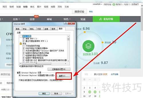 4、 在高级标签页中,可进行多项高级设置,页面底部还提供IE设置重置选项,点击重置按钮即可操作。