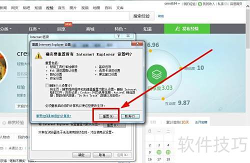5、 点击重置按钮后,系统会弹出确认提示,询问是否重置IE,并显示具体重置内容,我们继续执行重置操作。
