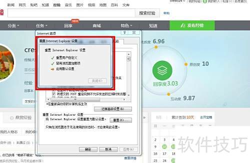 6、 随后系统将弹出IE设置重置对话框,显示重置进度,共有三个阶段,全部完成后才算成功重置IE。