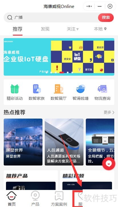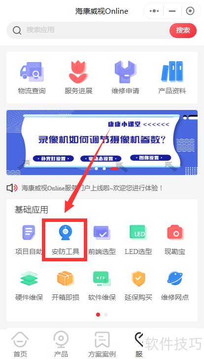 1、 打开手机微信中的海康威视online应用,点击界面中的服务按钮。