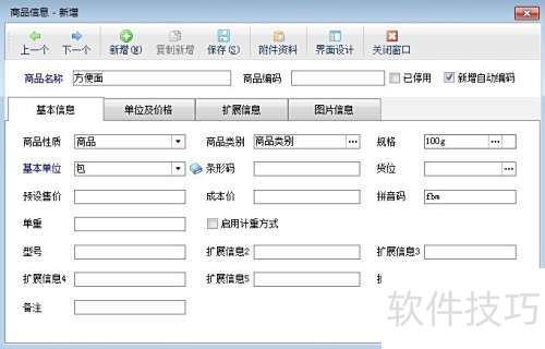 2、 在功能导航窗中选择基础资料下的商品信息,点击新增商品,填写商品名称、基本单位等基本信息,所示。