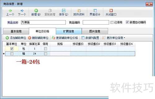 3、 在单位及价格界面中,可以添加辅助单位,并设置基本单位与辅助单位之间的换算关系。例如,对于商品方便面,可将基本单位包与辅助单位箱设为1箱等于24包,具体操作所示。