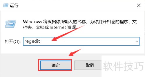 3、 在运行窗口中输入regedit并点击确定,所示。