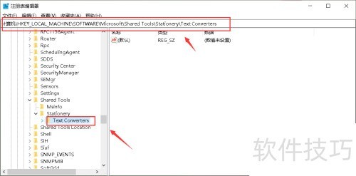 4、 打开注册表,依次展开项至 HKEY_LOCAL_MACHINESOFTWAREMicrosoftShared ToolsText Converters,界面效果所示。