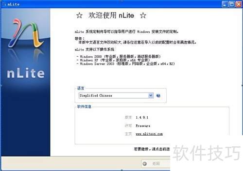 3、 启动nLite程序,选择简体中文,点击下一步。