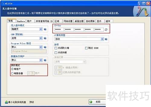 12、 无人值守安装可根据需求选择,通常采用默认设置,常见的有添加CD密钥和调整授权模式。