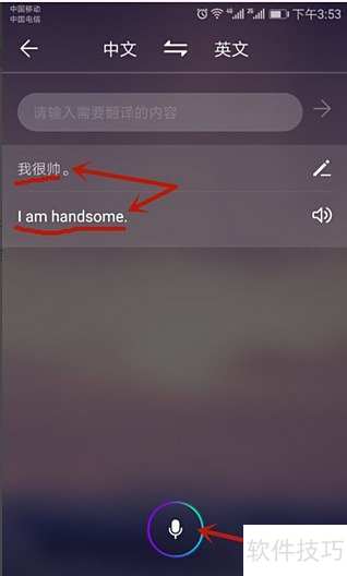 8、 在翻译界面点击麦图标,听到滴声后对着手机说话,系统识别声音后会将其翻译成英文并朗读出来。