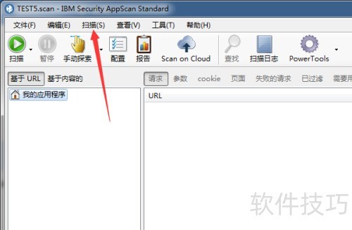 1、 打开Appscan应用界面后,选择菜单中的扫描选项开始操作。