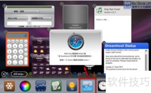 2、 打开 Safari 浏览器,进入目标网页后,依次点击文件菜单,选择在 Dashboard 中打开,即可将该网页创建为 Web Clip。