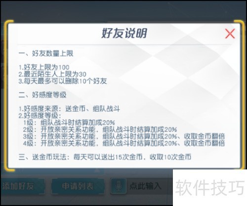 9、 好友上限为100人,近期新增陌生人上限30人,每日最多可删除10人,好感度及赠送金币功能详情所示。