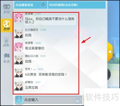 3、 打开聊天界面后,可见系统、世界、战队和队伍等多个聊天频道,所示。