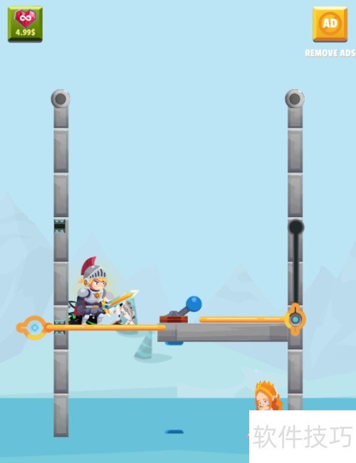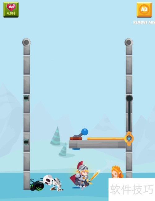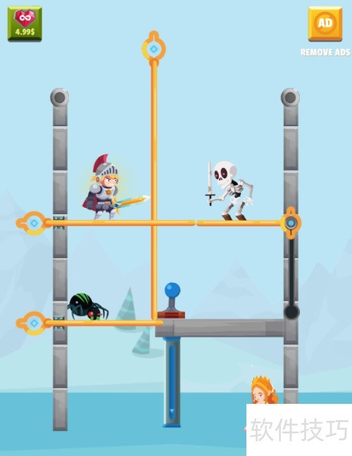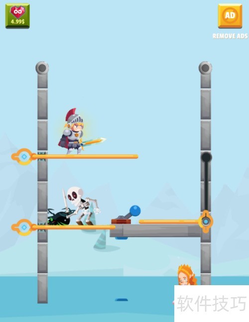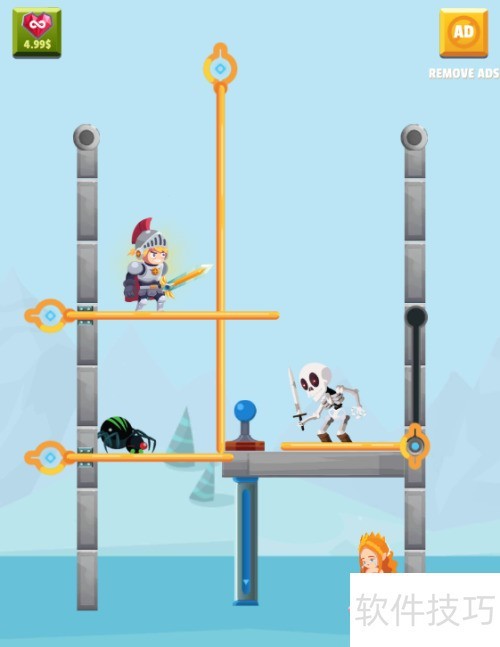 1、 少年位于骷髅兵左侧,需救出被困底部的公主,具体情形见图示。