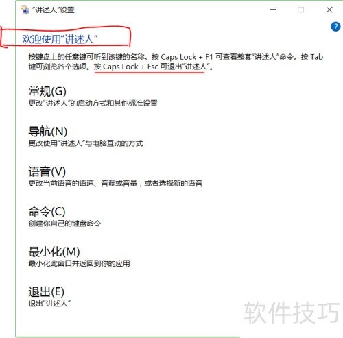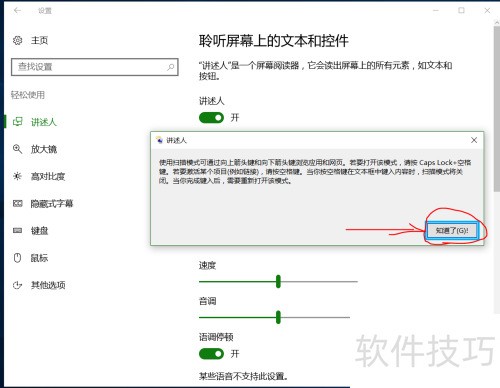 4、 在讲述人设置中,已配置的功能快捷键会显示相应提示。